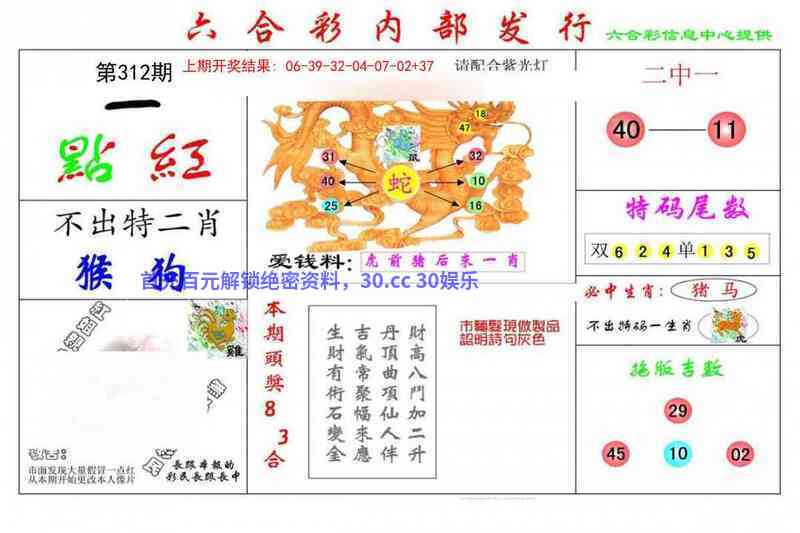 | 311期:天地+二肖〖地肖+猴兔〗开:蛇37准 |